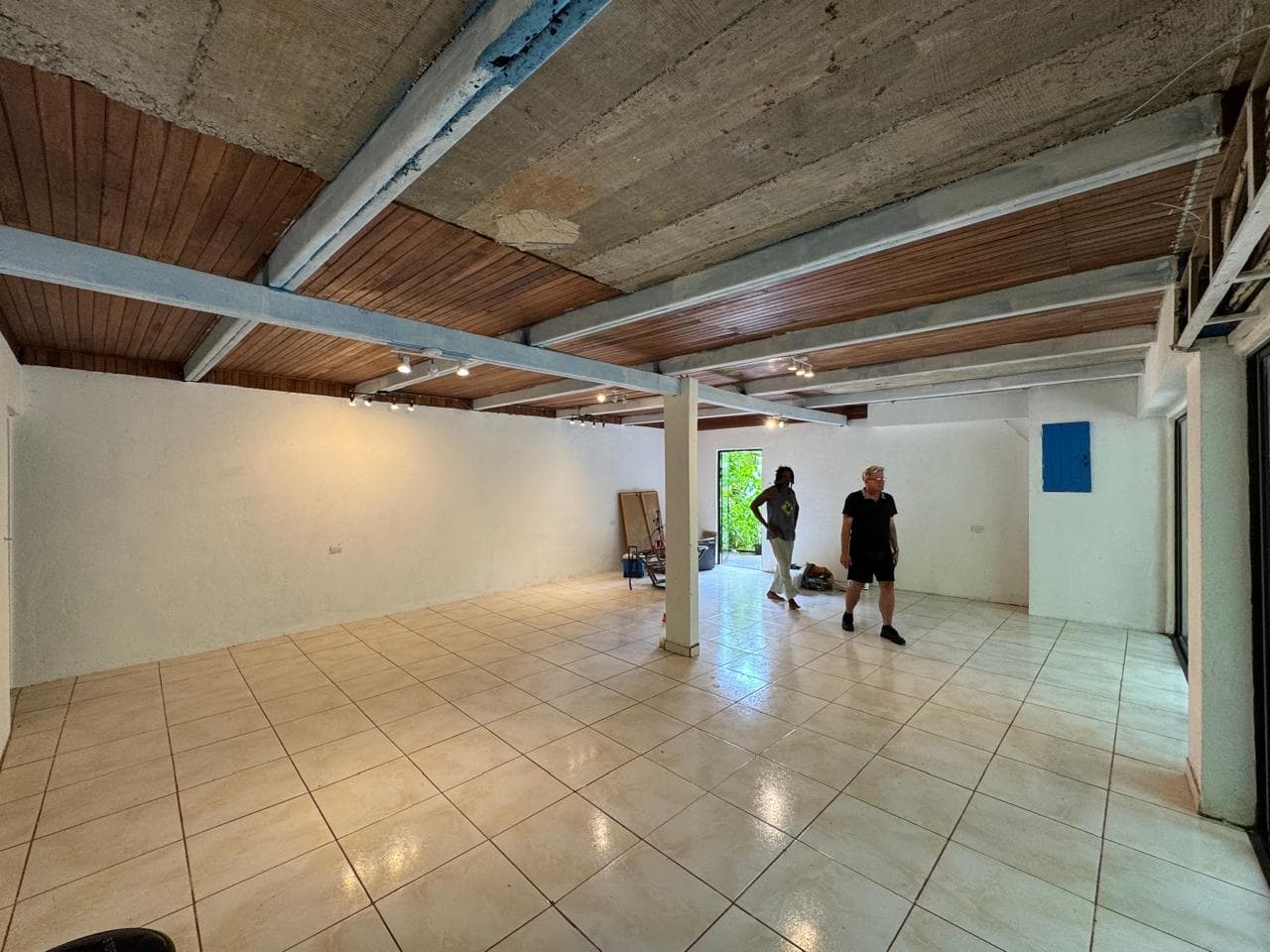 Spacious downstairs area finished with tile flooring, suitable for multipurpose use such as events, yoga, workshops, or storage.
