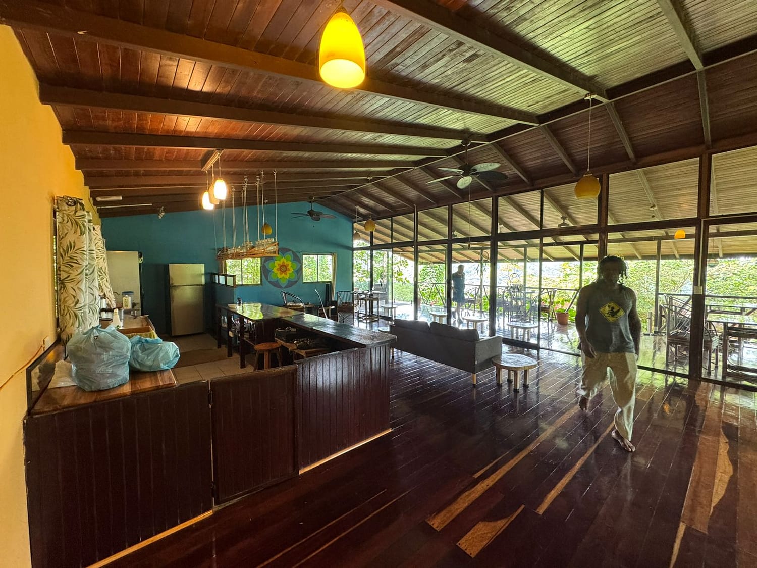 Upper level with wood floors and bamboo furnishings, offering a rustic jungle lodge atmosphere.